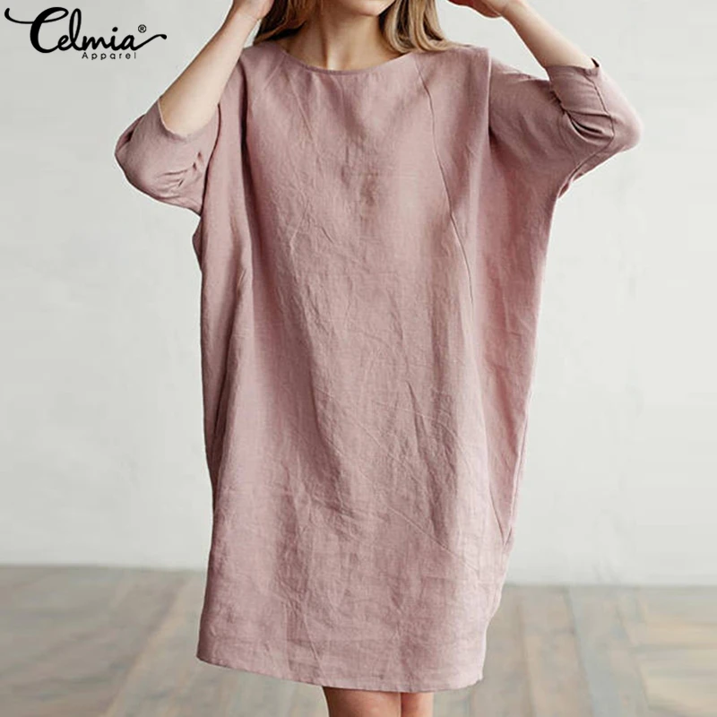Free shipping Celmia Women Long Shirt Cotton Linen Dress 3/4 Sleeve Pockets Vintage Dresses Ladies Casual Loose S
