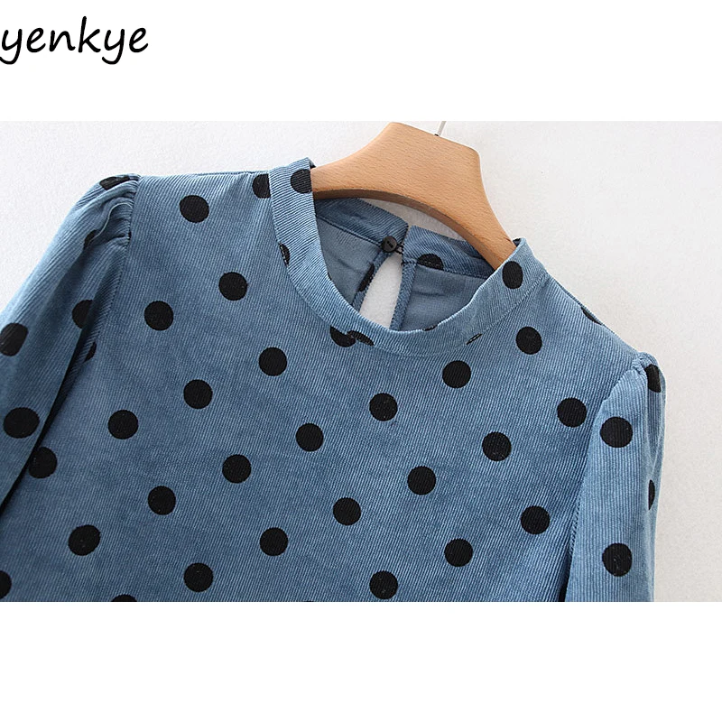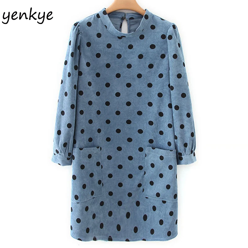 Promo Women Vintage Polka Dot Corduroy Dress Female Long Sleeve Stand Collar Pockets Straight Mini Autumn