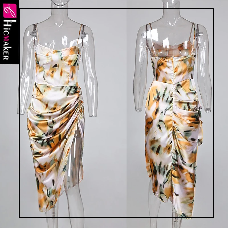 Cheap Abstract Print Spaghetti Strap High Slit Ruched Dress Women Stretch Sleeveless Sexy & Club Night Ou