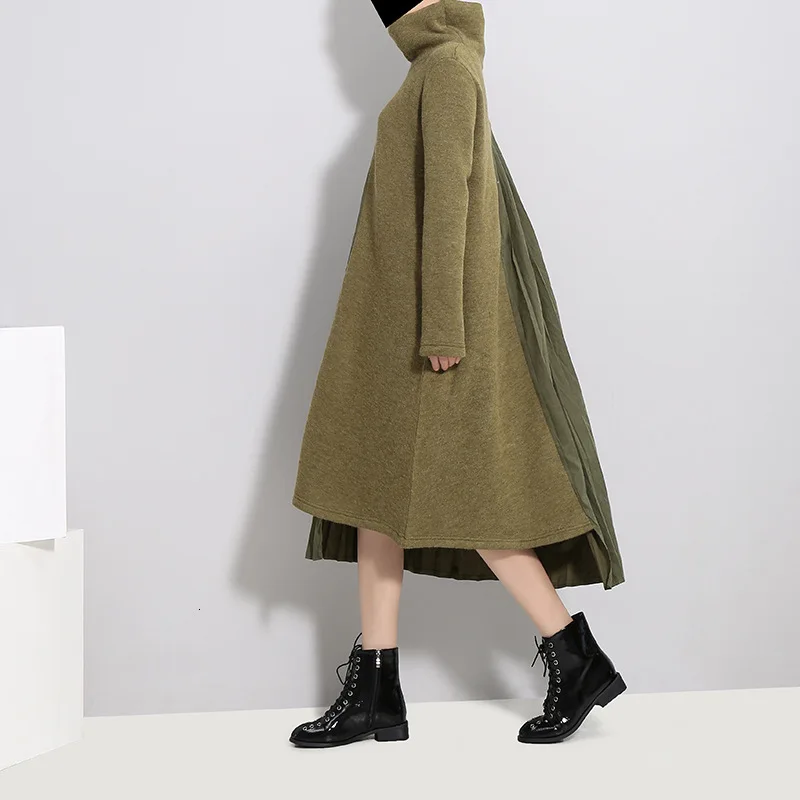 Promo [EAM] Women Asymmetrical Pleated Knitting Dress New High Collar Long Sleeve Loose Fit Fashion Tide